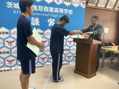 伝達表彰式では、夏季休業中の大会成果として、バドミントン部、生徒商業研究発表大会の